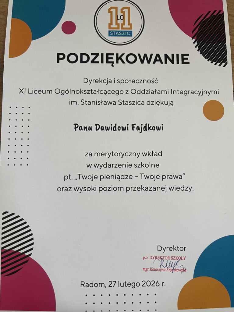 W dniu 27 lutego Mecenas Dawid Fajdek brał udział w wydarzeniu szkolnym pt. ” Twoje pieniądze – Twoje prawa” w XI Liceum Ogólnokształcącym z Oddziałami Integracyjnymi im. Stanisława Staszica. Przedmiotem prelekcji była tematyka oscylująca wokół praw konsumenta na gruncie obowiązujących przepisów prawa. Podziękowania w tym zakresie, za zaproszenie i możliwość udziału w wydarzeniu, Kancelaria kieruje do Pani Dyrektor Szkoły.